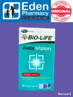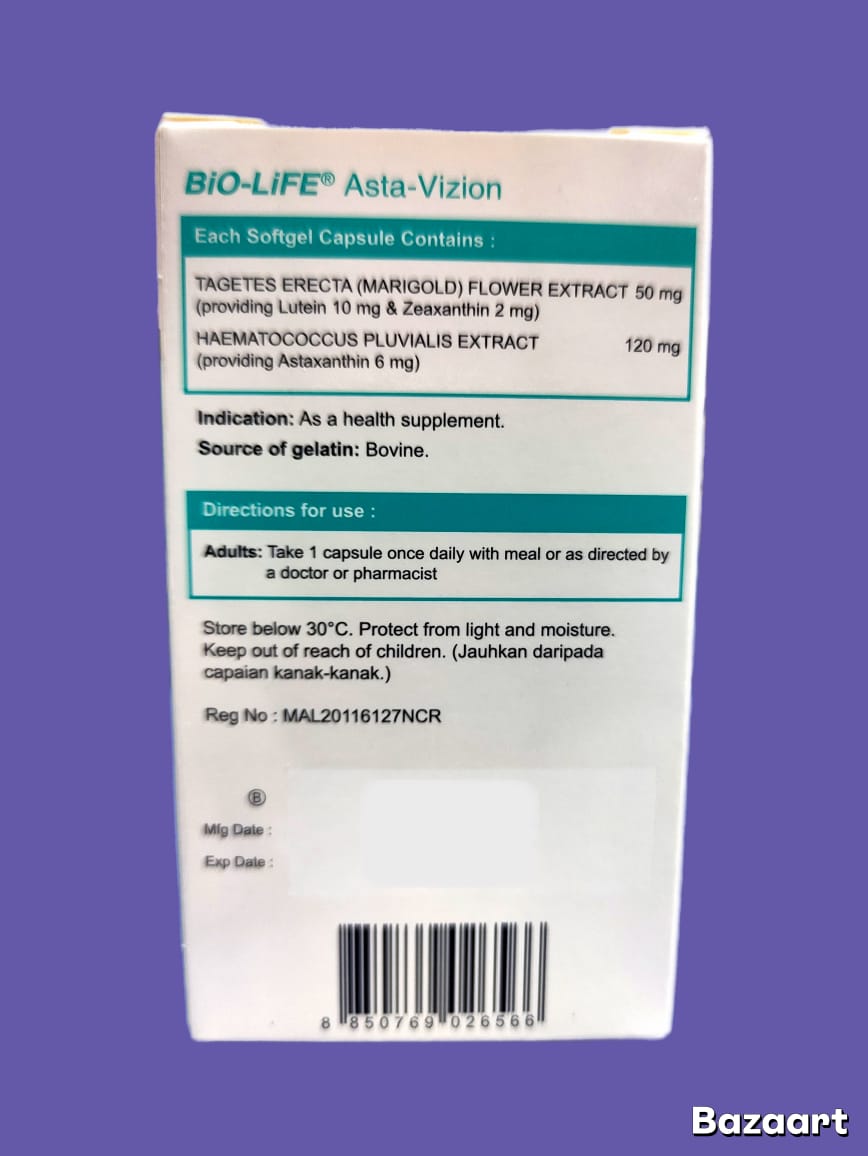 Bio-Life Asta-Vizion is a dietary supplement formulated to support and maintain healthy vision. It contains three key antioxidants: lutein, zeaxanthin, and astaxanthin. These nutrients are known for their protective roles in eye health, particularly in filtering harmful blue light and reducing oxidative stress in the eyes. Lutein and zeaxanthin are naturally found in the retina and are essential for maintaining the health of the macula, the part of the eye responsible for central vision. Astaxanthin, derived from microalgae, is a powerful antioxidant that may help reduce eye fatigue and improve focus, especially for individuals who spend long hours looking at digital screens. This supplement is often recommended for adults who are exposed to UV or blue light regularly, have age-related vision concerns, or simply want to support their long-term eye health. It is usually taken once daily after meals and is intended to complement a healthy diet, not to replace medical treatment for eye conditions.