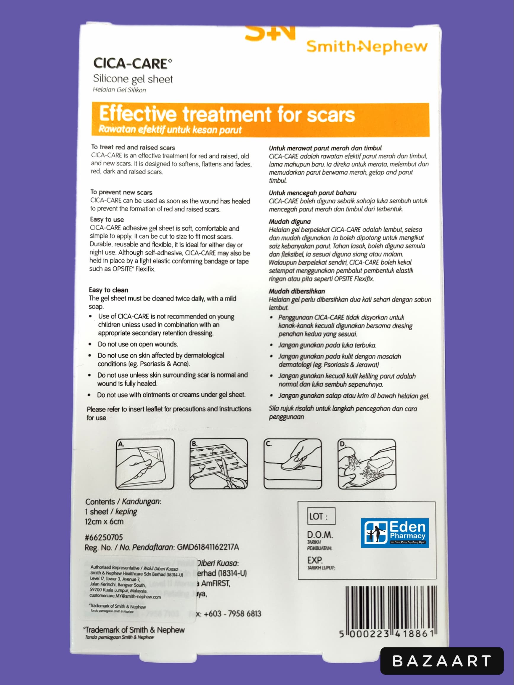 CICA-CARE adhesive gel sheet is soft, comfortable and simple to apply. It can be cut to size to fit most scars. Durable, reusable and flexible, it is ideal for either day or night use. Although self-adhesive, CICA-CARE may also be held in place by a light elastic conforming bandage or tape such as OPSITE Flexifix.