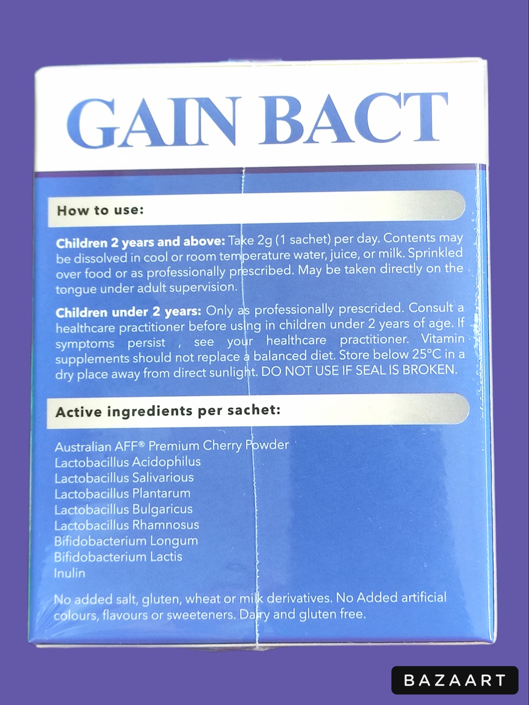 GAIN BACT Probiotic for daily health contains live good cultures which are boosted with a prebiotic for general wellbeing.