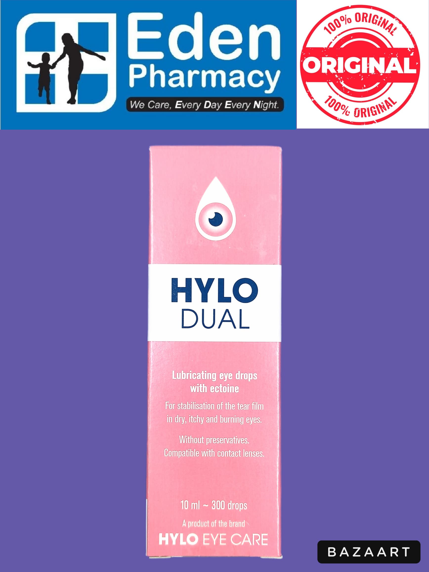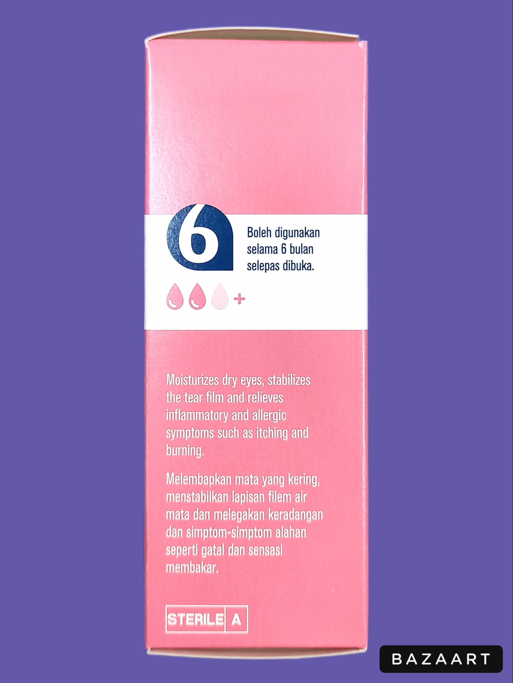 Moidturizes dry eyes, stabilizes the tear film and relieves inflammatory and allergic symptoms such as itching and burning.