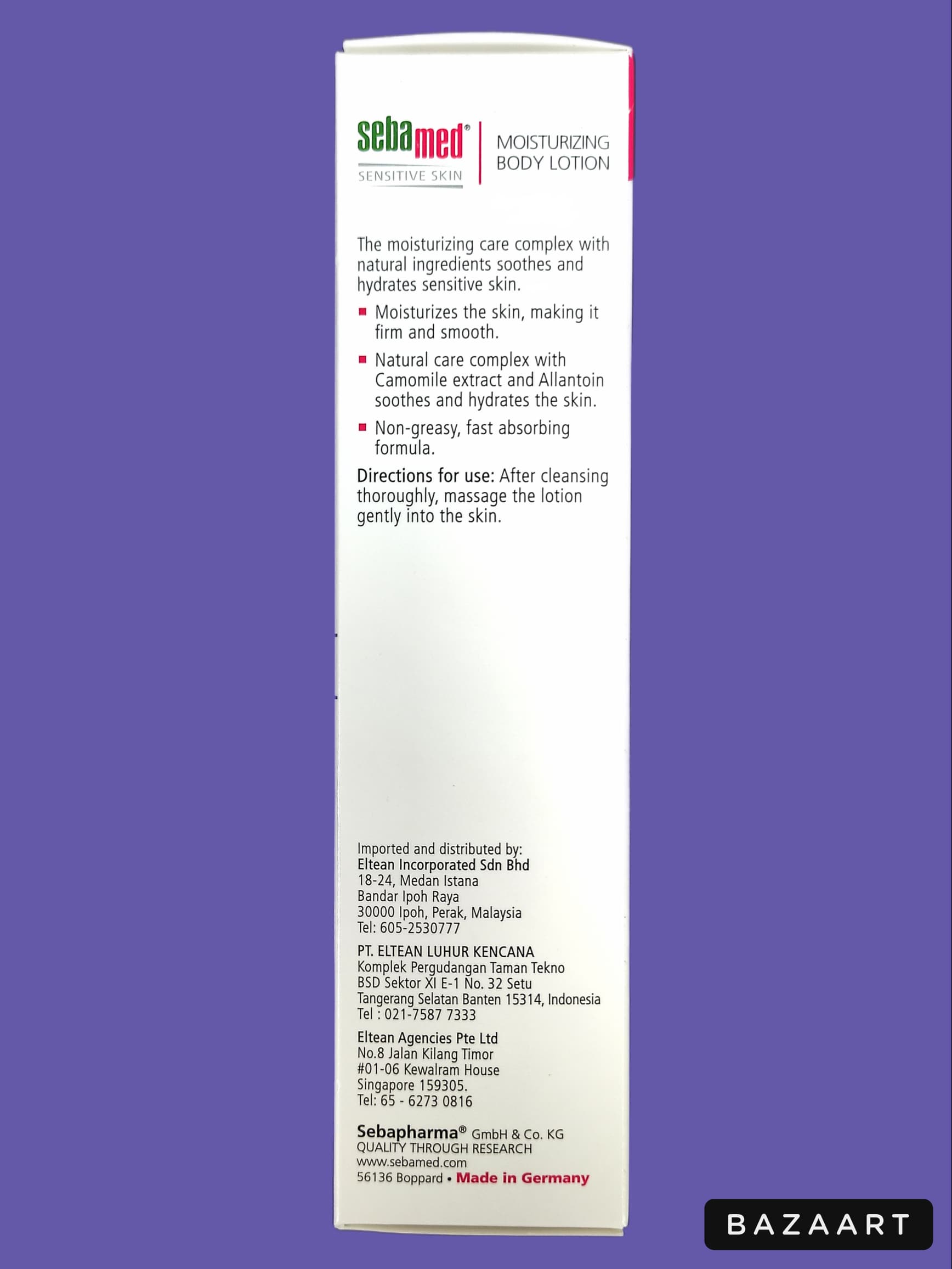 Sebamed moisturizing body lotion preserves and supports the natural moisture balance of your skin, making it smooth and supple. Regular use strengthens the elasticity of the skin giving it a more youthful appearance. sebamed Mositurizing Body Lotion can be easily applied and is absorbed rapidly by the skin without making it shiny or leaving a greasy residue. It has a pleasant and delicate fragrance. The active ingredient complex of sebamed Moisturizing Body Lotion provides the care your skin needs to maintain its healthy appearance.